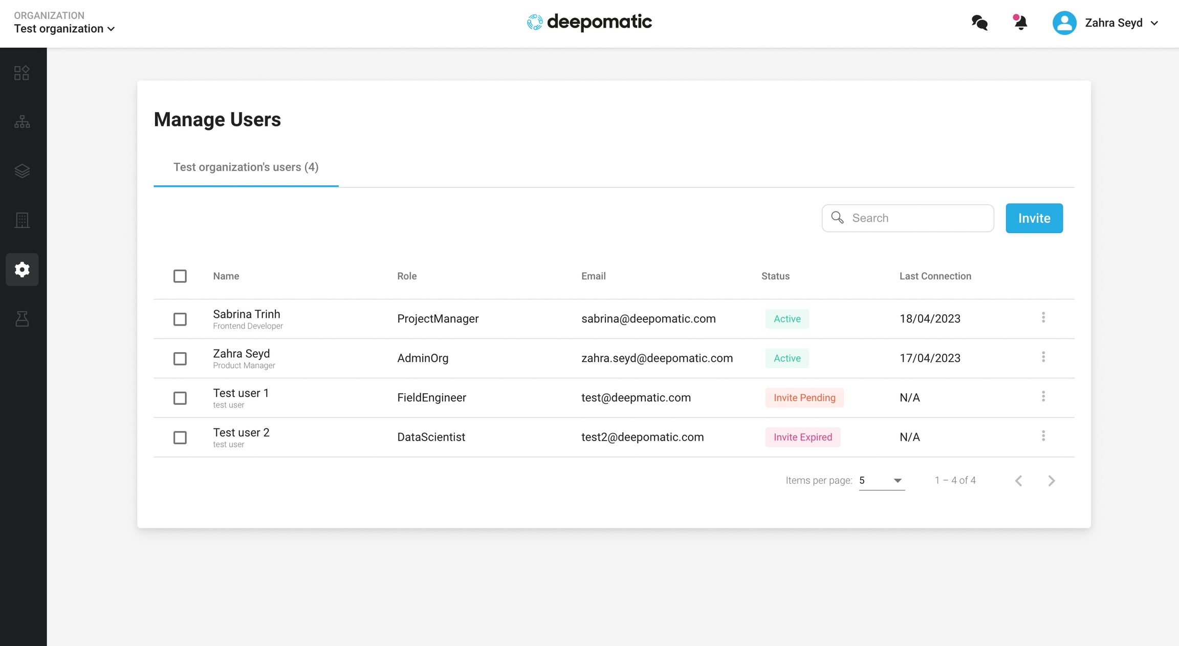 Admin users of an organization are able to invite and manage users as well as their permissions, through the admin page of the platform.