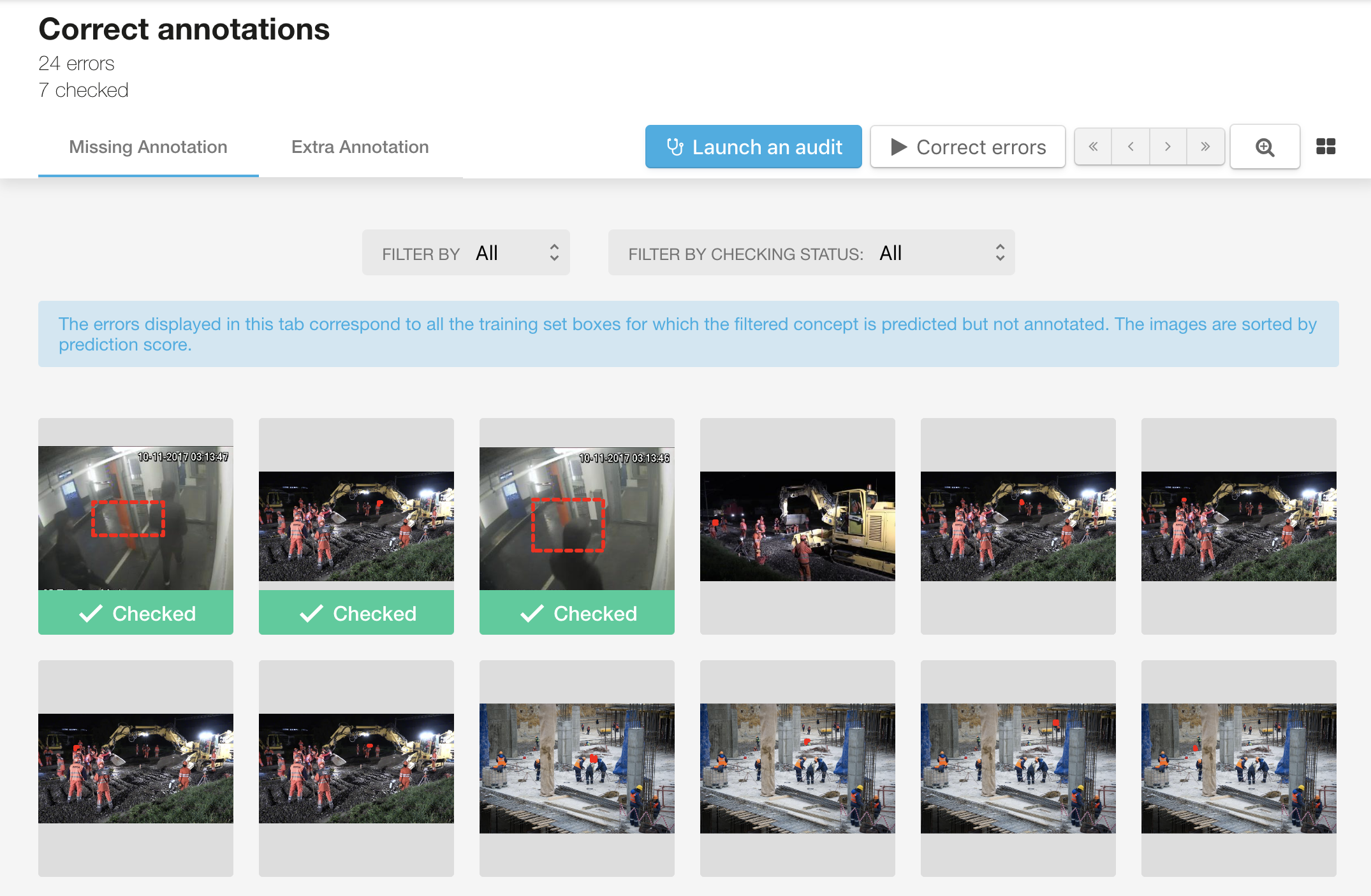 Having datasets that are as clean as possible is crucial to optimizing the performance achieved by your models. A clean dataset is a dataset for which there are no annotation errors. When working on datasets of tens of thousands or even millions of images, it is very complicated in practice to achieve this. Indeed, annotating images with bounding boxes and with visual concepts is a tedious task, and like all painful and repetitive tasks, we humans make mistakes when we do them on large volumes. On the Deepomatic platform, you can run audits on your annotations that will display images for which there are potential errors.