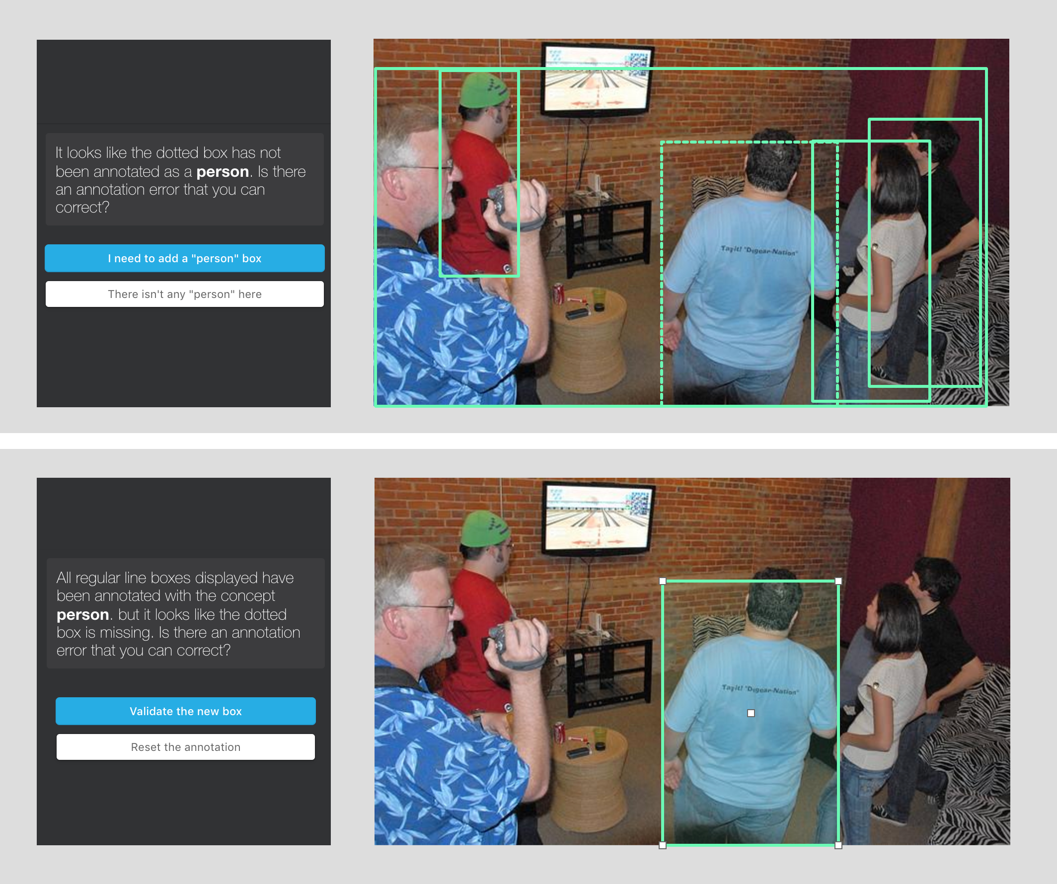 Detection: a missing annotation corresponds to a box that has been forgotten. Correcting an annotation is then about deciding whether the proposed region of the image should be annotated with a box of a given concept or not, and not about the whole image annotation, and adding or removing boxes for all concepts.
