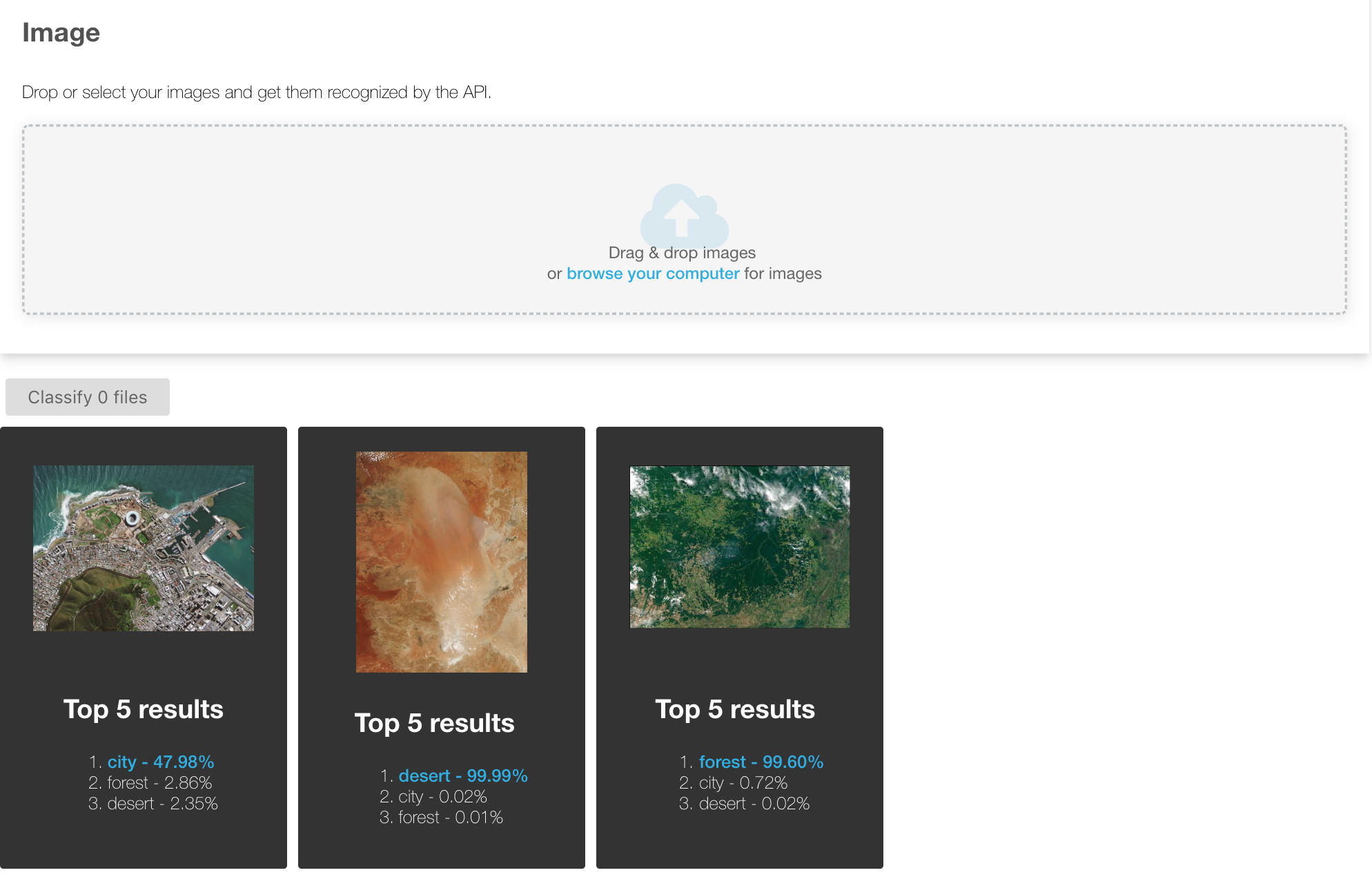 You can either drag & drop images, or enter several image URLs. Your images will go through the neural network you have trained and you will get the predictions for these images.