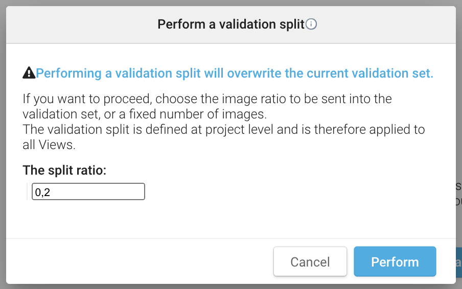 To avoid any bias, we need to create two separate and independent sets of images. Indeed, you don't want to evaluate the performance of a model on the same set of images it has been trained on. Hence, we distinguish between training and validation sets. By default, when you do not specify any information, all the images that you add to a project are added to the training set. To create or change the validation set, you need to click on Perform a validation split on the navigation bar in the Galleries section.
