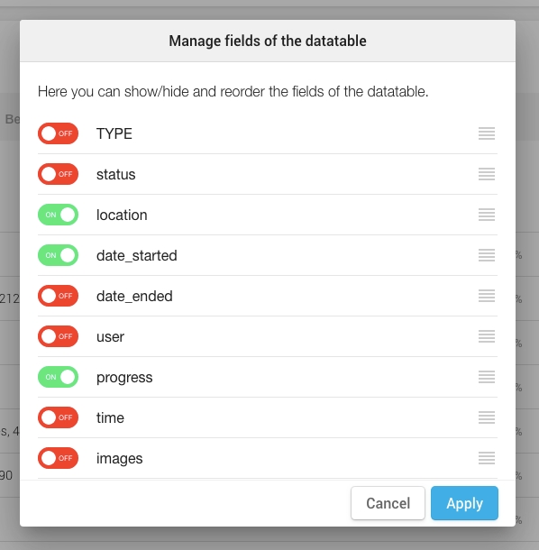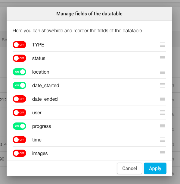 The columns of this view are customizable. You can click on "Manage fields" at any time to select the fields you wish to display and order them in the most optimal way. It is also possible to add fields via your application settings.