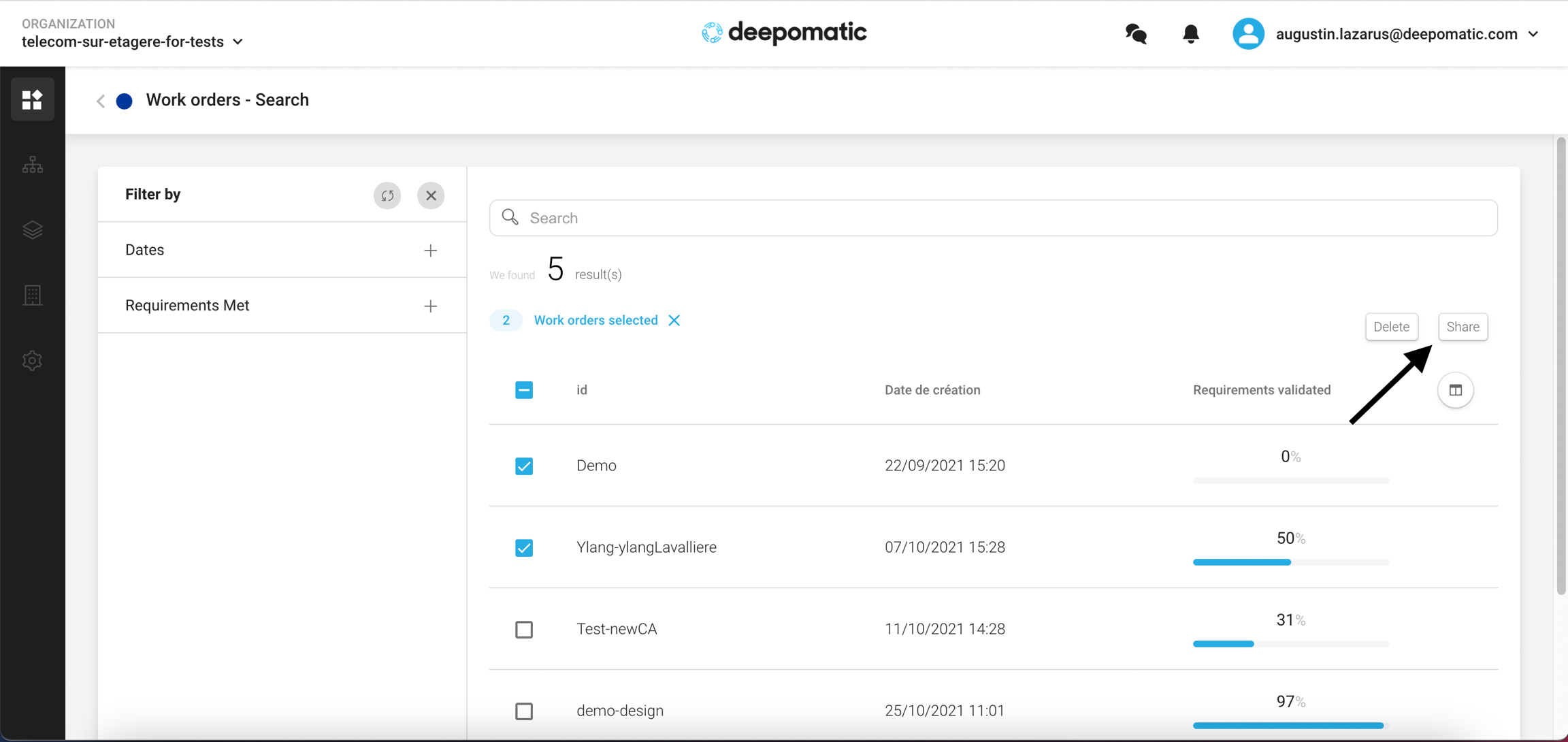 After having performed a search, the user has the possibility to select work orders in order to share them with someone else.