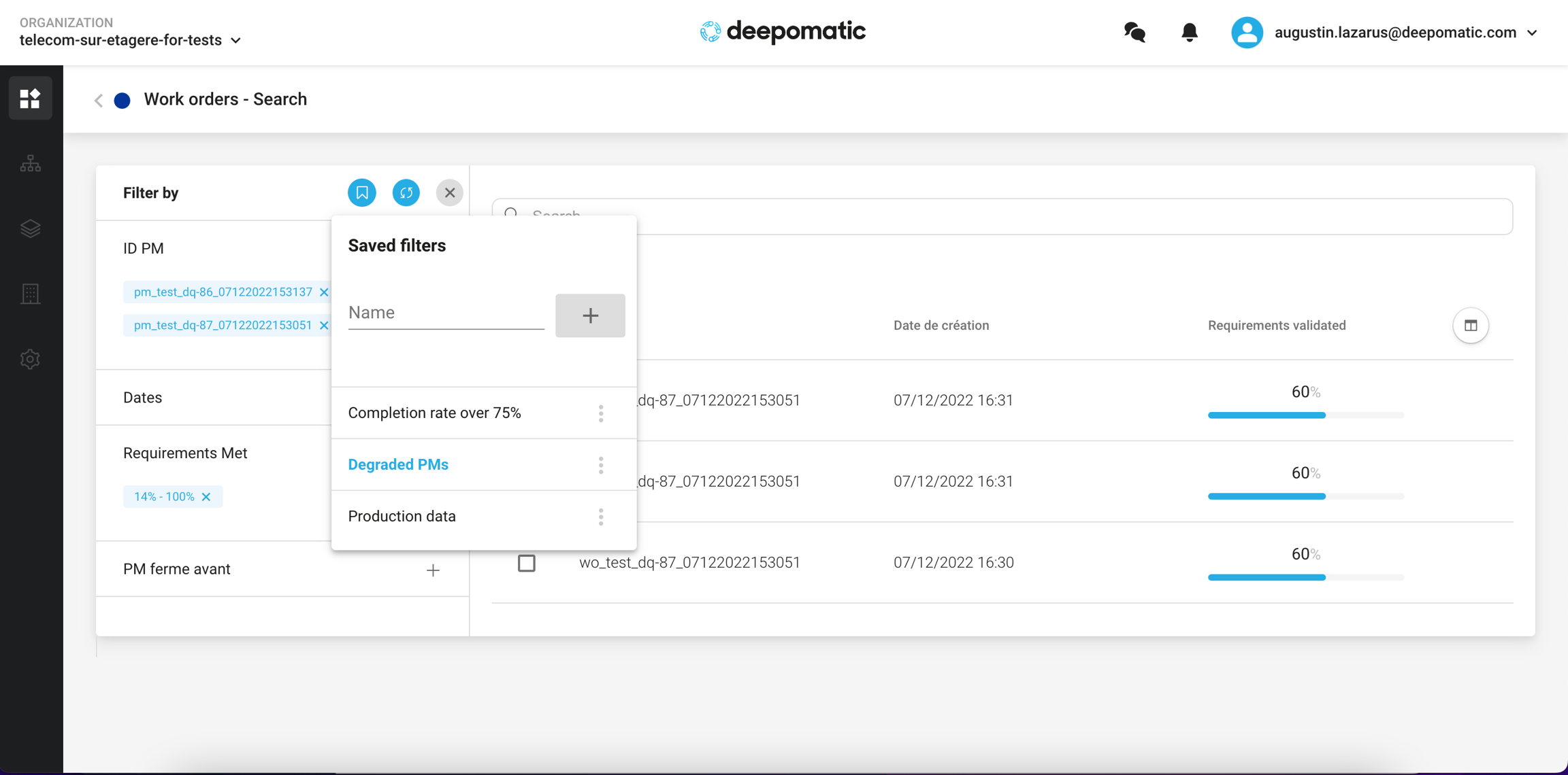If a user often performs the same combination of filters, he has the ability to save it so it is then possible to retrieve it in one click.