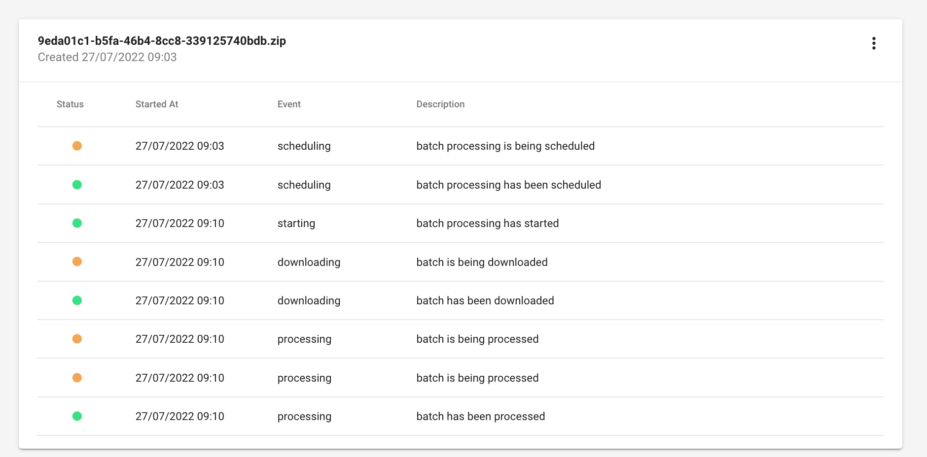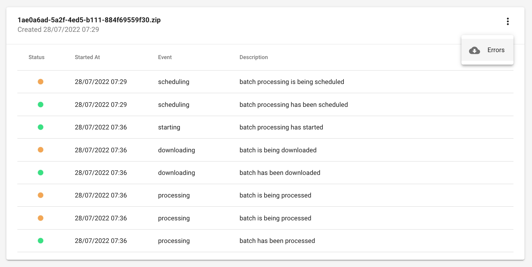 On the Deepomatic platform, you can access the list of batches that have been created for a given site and track their processing status.