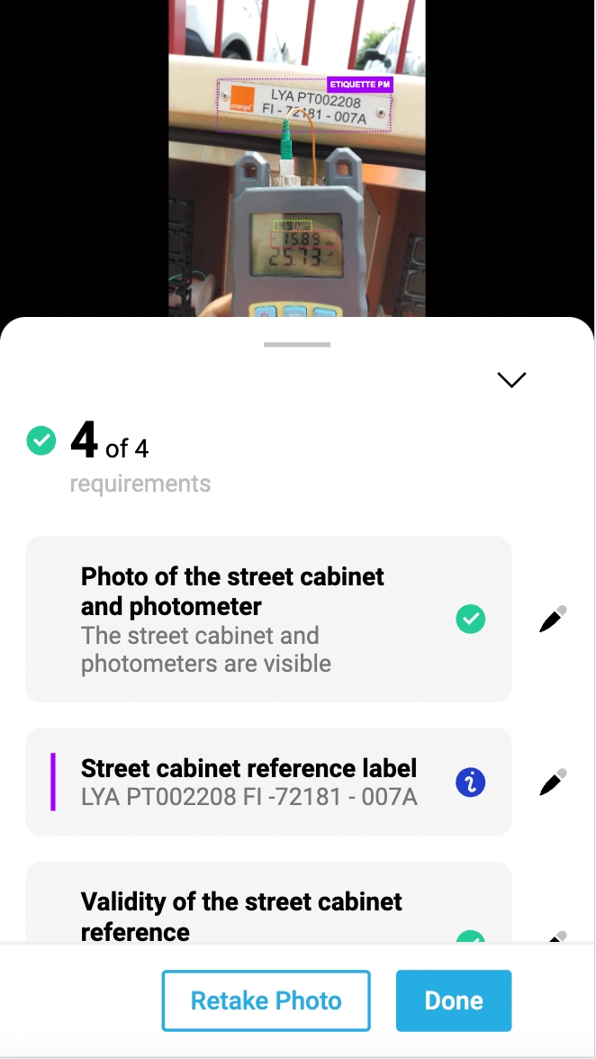 If the data conformity is satisfying, we proceed to the second step by checking the job conformity. One or several tasks can be analyzed on a photo and the technician will receive a feedback for each one of the analyzed tasks.