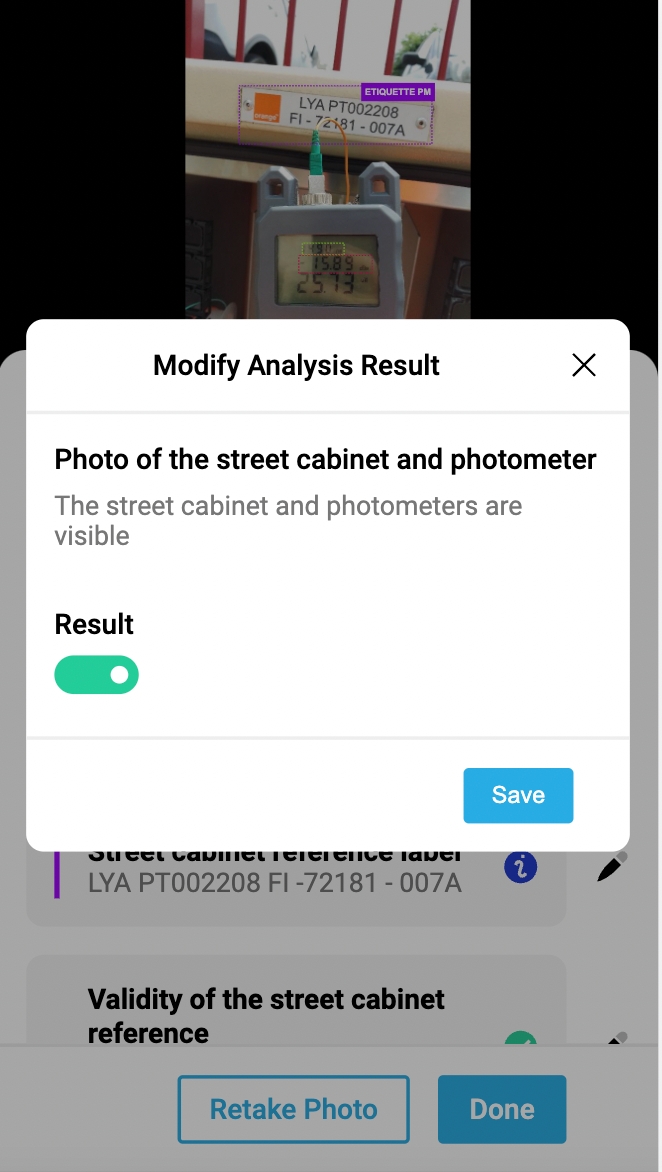 If the technician does not agree with the analysis made by AI, he can either retake a photo or manually edit the analysis (this action will be highlighted for back office users). The ability or not to edit the results is configurable.