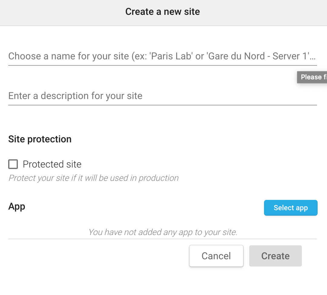Give a name to your site and add a description. If this site will be used in production, you need to specify that your site needs to be protected. You then need to select the app you want to deploy on your site by clicking on Select app. You can only deploy one application to a site at any one time.