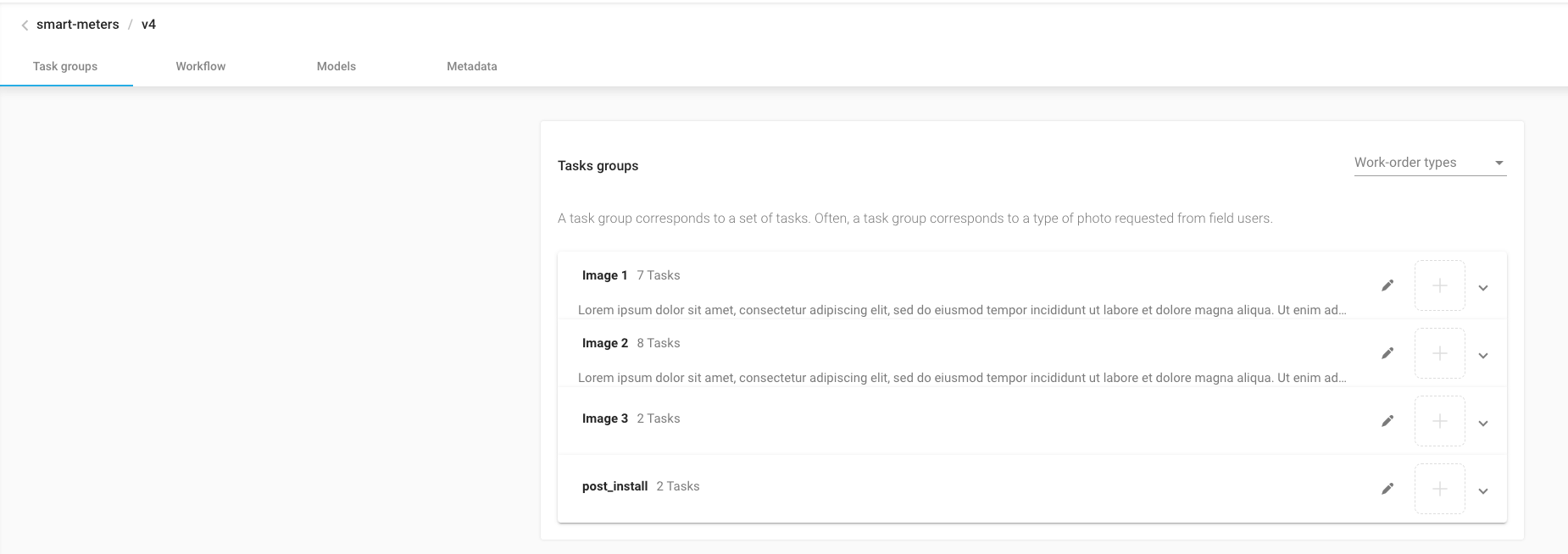 A new work order type filter can be used to easily see which task-groups and tasks are in specific work-order-types.