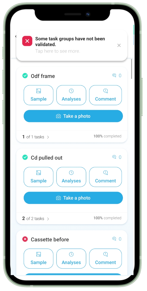 Then, once the pictures have been analyzed by our system, the field workers receive notifications in case some task groups have not been validated. In the notification centre, they have access to all the task groups that have not been validated.